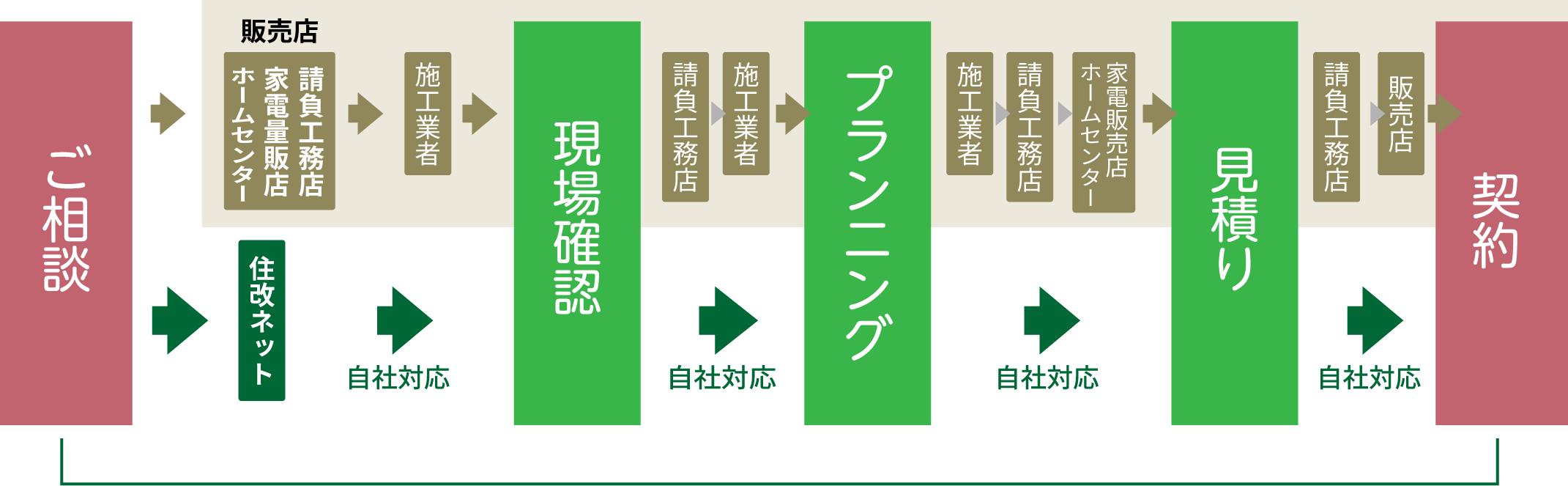 住改ネットは、お客様と直接つながり、ヒアリングから施工・アフターメンテナンスまでを一貫して自社で対応しています。これにより、中間業者のコストや情報のズレがなく、価格と品質の両面で 「ちょうどいい」工事が実現できます。